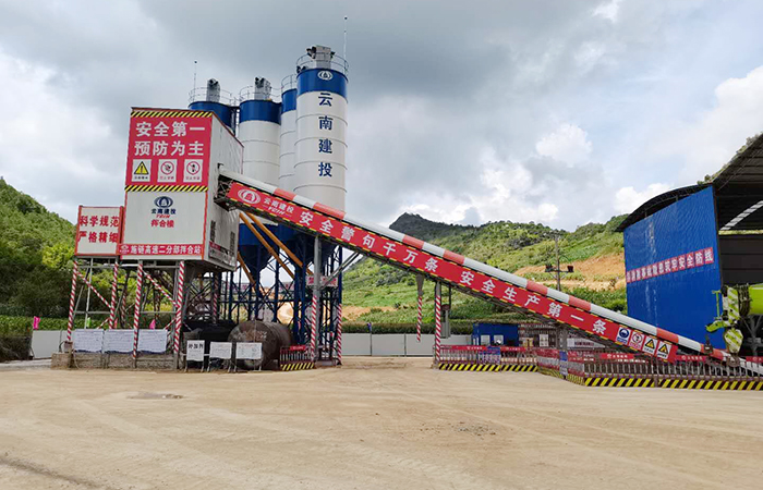 【拌合站概況】施鏈高速二分部自建拌合站選址于施甸縣萬(wàn)興鄉(xiāng),拌合站具體位置為爛麥地右側(cè),K14+100左側(cè),占地面積9.93畝。考慮到復(fù)雜的周邊環(huán)境,拌合站在選址時(shí)依據(jù)了運(yùn)輸距離較短、征地及復(fù)墾量少,以及場(chǎng)地周?chē)鸁o(wú)塌方、滑坡、落石、泥石流、洪澇等地質(zhì)災(zāi)害的原則,最終建設(shè)地距主線近,交通便利,便于原材料進(jìn)場(chǎng)及場(chǎng)內(nèi)生產(chǎn)的混凝土運(yùn)至施工現(xiàn)場(chǎng),拌合站管理便利。拌合站設(shè)有砂、石堆料儲(chǔ)料倉(cāng),共設(shè)5個(gè)料倉(cāng)(石料倉(cāng)3個(gè)、機(jī)制砂1個(gè)、河沙1個(gè)),總體尺寸為78.6m×16m。
