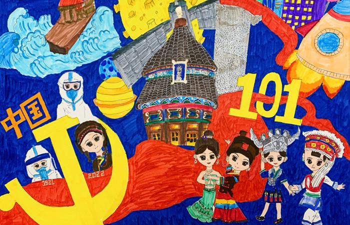 寓意:此畫(huà)旨在倡導(dǎo)我們要從小“知黨恩、聽(tīng)黨話(huà)、跟黨走”,自覺(jué)踐行社會(huì)主義核心價(jià)值觀,弘揚(yáng)“紅船精神”,為實(shí)現(xiàn)中華民族偉大復(fù)興的中國(guó)夢(mèng)而努力奮斗。小作者用自己手中的畫(huà)筆將心中對(duì)祖國(guó)的熱愛(ài)與崇敬,對(duì)黨的信仰,通過(guò)繪畫(huà)Q版的少數(shù)民族來(lái)表達(dá)56個(gè)民族一家親,表達(dá)中國(guó)人民的團(tuán)結(jié)奮進(jìn),還有我們的抗疫英雄,北京的歷史宮殿祈年殿來(lái)表達(dá)我們偉大祖國(guó)的歷史文化底蘊(yùn),通過(guò)繪畫(huà)現(xiàn)代高樓、月球、火箭等表達(dá)祖國(guó)現(xiàn)今的飛速發(fā)展和實(shí)力,輕輕飛舞的紅絲帶、黨徽、紅船,沉甸甸的展現(xiàn)出我們的百年大黨,提醒我們不忘初心 砥礪奮進(jìn)。通過(guò)“喜迎二十大、永遠(yuǎn)跟黨走、奮進(jìn)新征程、爭(zhēng)做好少年”,體會(huì)到小作者愛(ài)國(guó)愛(ài)黨愛(ài)社會(huì)主義,胸懷祖國(guó),爭(zhēng)當(dāng)好少年,最美的信仰在心中。用畫(huà)作來(lái)感悟偉大祖國(guó)的巨變,為生為中國(guó)人而感到驕傲和自豪,傳達(dá)愛(ài)國(guó)情懷。