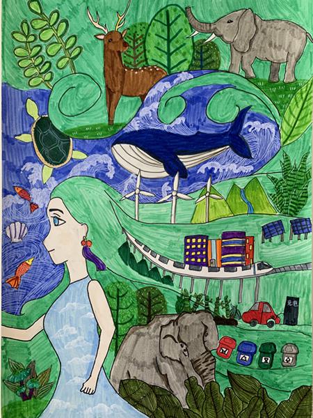 寓意:春姑娘披著一頭翠綠的長發(fā)緩緩地朝我們走來了。輕柔的暖風(fēng)送來鳥兒的歡歌。各種新嫩枝葉都敞開了胸懷,有翠綠的,嫩綠的,深綠的,一起享受著這從密葉林間穿透而過的初夏的陽光。在這綠茵茵的發(fā)絲上風(fēng)車隨意的轉(zhuǎn)動著一圈又一圈,青山綠草在春姑娘翠綠的發(fā)絲中探了出來,城市的新地、高樓、高鐵、充電節(jié)能小汽車、還有風(fēng)力發(fā)電……一片欣欣向榮的景象沐浴著生活的陽光,在飄逸長發(fā)中搖曳。春姑娘那溫柔美好的眼神,甜甜的微笑,還有細微的眉頭,都能讓人感受到生命的美好,各種小動物、植物也都隨著他們的腳步在春光中醒來,展示著生命的可貴。