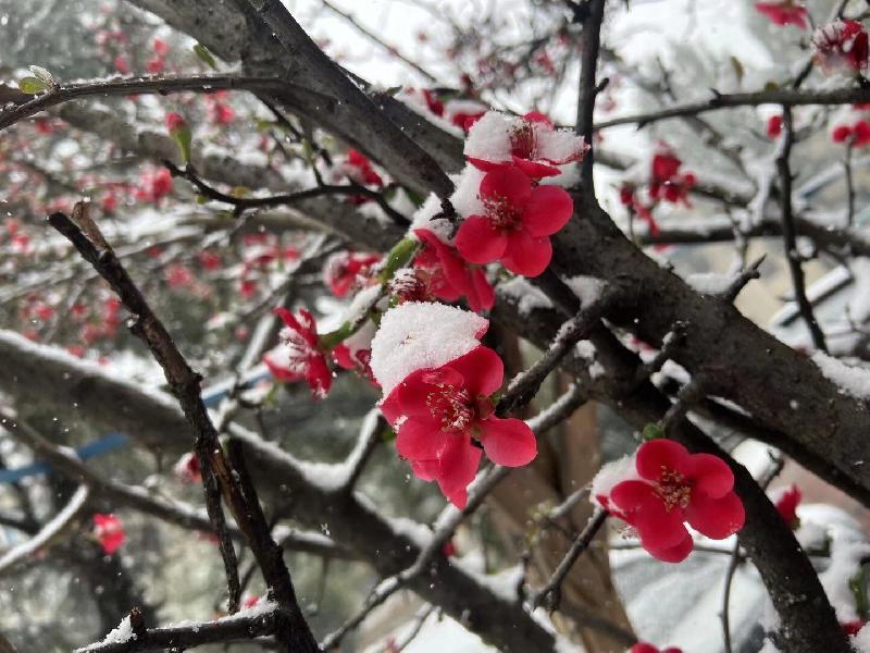 雪,冰封了一切。大院里的木瓜樹開花了,熱情地接受著這冰冷的一切。熱烈的綻放。