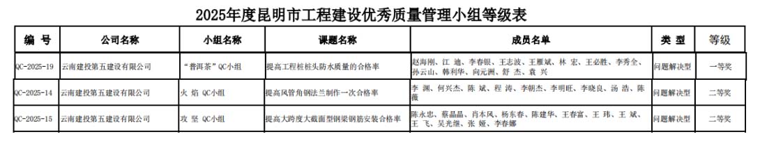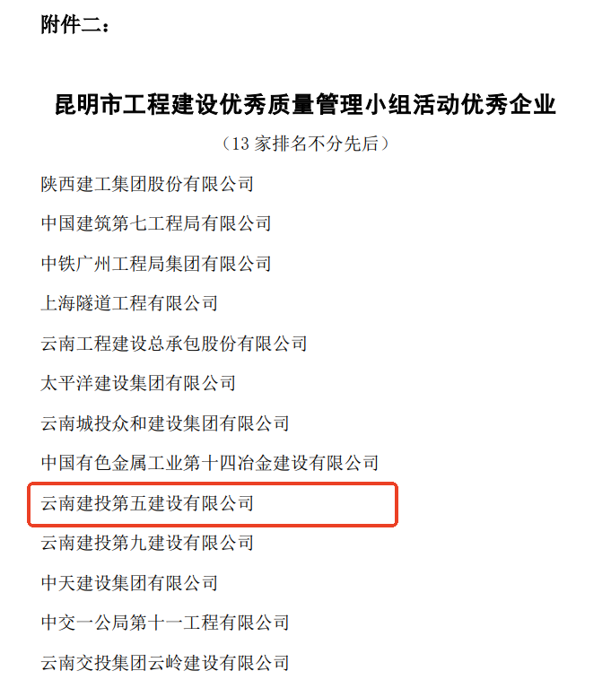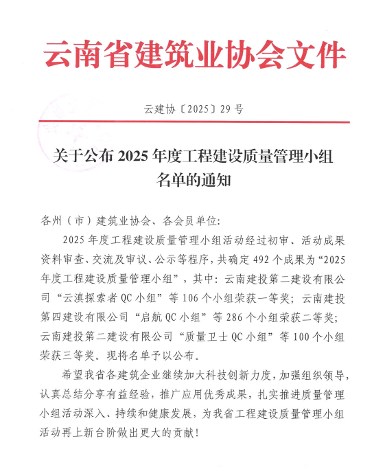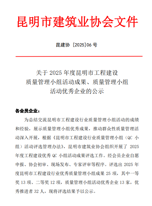 技術(shù)支持: 方森科技近日,云南省建筑業(yè)協(xié)會、昆明市建筑業(yè)協(xié)會相繼公布2025年度工程建設優(yōu)秀質(zhì)量管理小組成果評選結(jié)果,公司共8項優(yōu)秀QC成果獲獎,其中云南省建筑業(yè)協(xié)會一等獎2項,二等獎1項,三等獎2項;昆明市建筑業(yè)協(xié)會一等獎1項,二等獎2項。公司獲評昆明市建筑業(yè)協(xié)會“工程建設優(yōu)秀質(zhì)量管理小組活動優(yōu)秀企業(yè)”稱號。