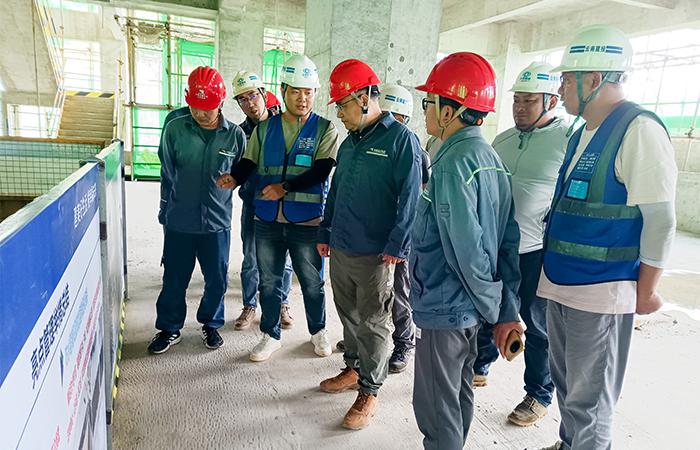 趙建兵一行深入施工現(xiàn)場,實地查看項目現(xiàn)場安全文明施工、臨時用電設(shè)施管理、施工實體質(zhì)量及項目文化建設(shè)等情況,對項目現(xiàn)場標(biāo)準(zhǔn)化施工、安全質(zhì)量管控措施及重點部位安全防護(hù)工作成效給予充分肯定。雙方圍繞項目現(xiàn)場平面布局優(yōu)化、配變電專項設(shè)計施工招標(biāo)、裝飾裝修方案確定等重要事宜展開深入研討。檢查組細(xì)致查閱了相關(guān)資料,認(rèn)真聽取施工難點匯報及解決措施,進(jìn)一步明確了項目后續(xù)管理工作思路。