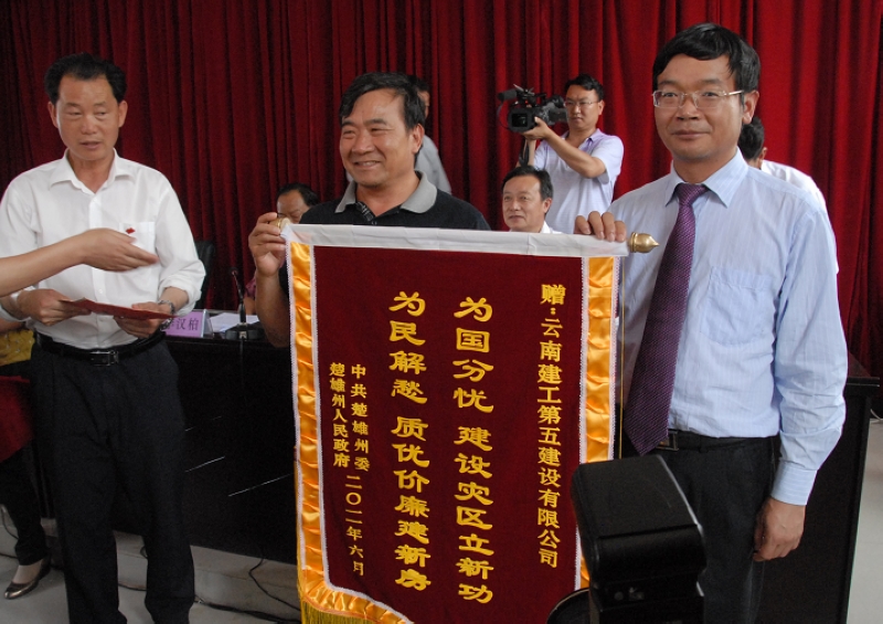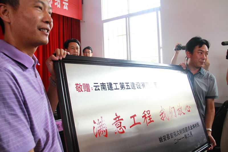 正是懷著這樣崇高的使命感和責任感,他們一步一個腳印地走到了最后,楚雄州州委、州政府為他們送上一面錦旗,說他們“為國分憂為民解愁”。楚雄州姚安縣委、縣政府為他們獻上一塊牌匾——建筑“鐵軍”,放心工程。官屯村的村民們?yōu)樗麄儷I上一塊牌匾——滿意工程,我們放心。或者就是因為他們自覺地把百姓利益與國企責任聯(lián)系在了一起,才贏得了來自社會各界那么多的肯定,而這也恰恰成了他們在這個七•一為我們的黨獻上的,最美好的禮物!