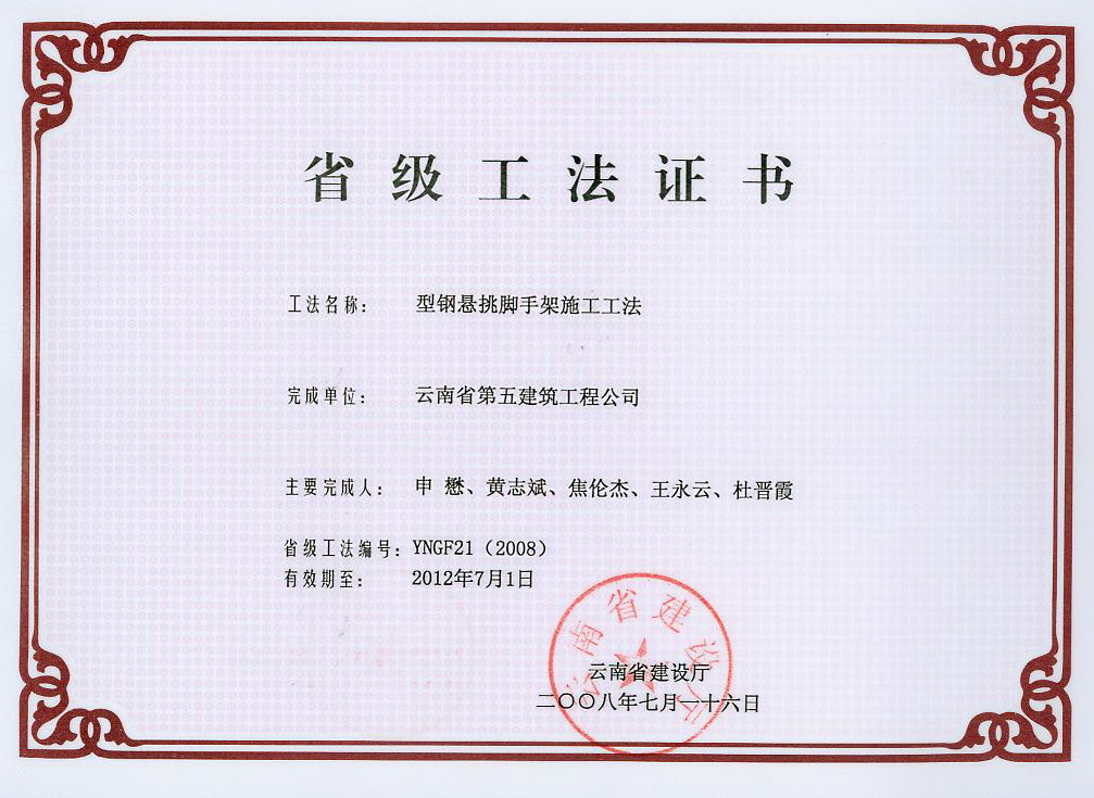 云南五建編制的省級(jí)工法——型鋼懸挑腳手架施工工法