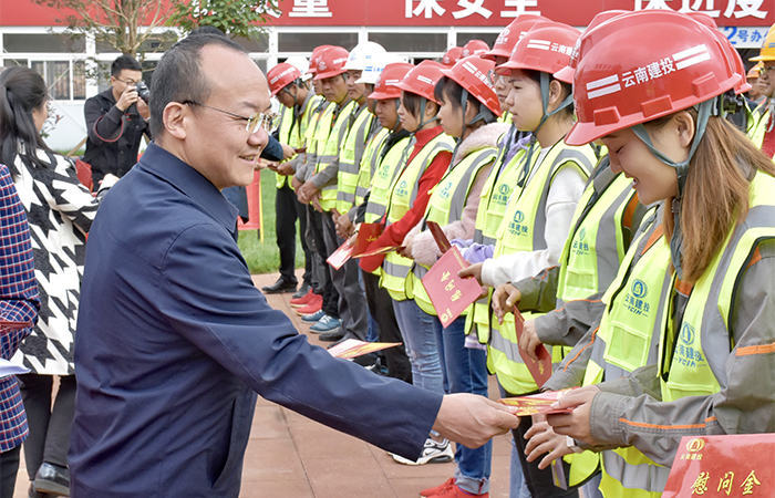 9月18日上午,集團公司黨委副書記、工會主席陳文雙到公司云南綠色能源產業(yè)園區(qū)項目對奮戰(zhàn)在一線的114名項目管理人員和50名民工代表進行慰問,集團工會副主席趙艷波,公司黨委書記、副董事長張曉峰,總經濟師呂榮偉,工會主席冷蕊參加慰問。
